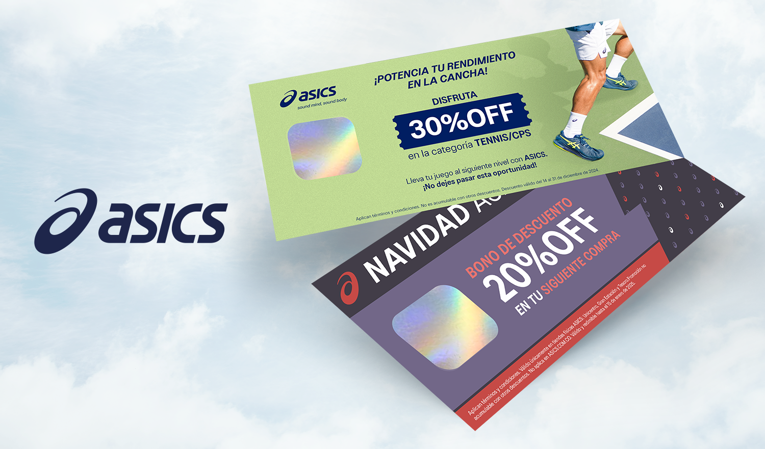 Diseño de cupones con descuentos especiales para las diferentes tiendas de ASICS Colombia.