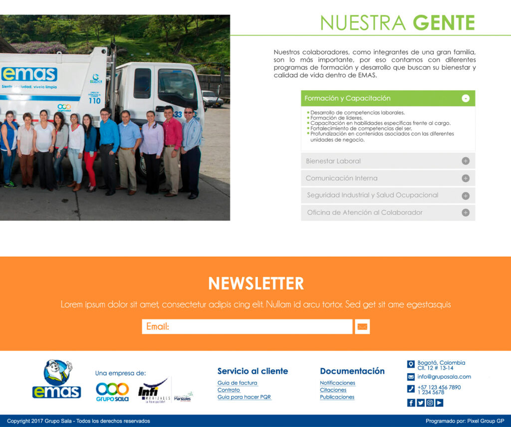 Diseño UI, UX e IXD paras la páginas web del Grupo Sala, Emas Cali y Emas Pasto, además del diseño me encargue del Front End básico.